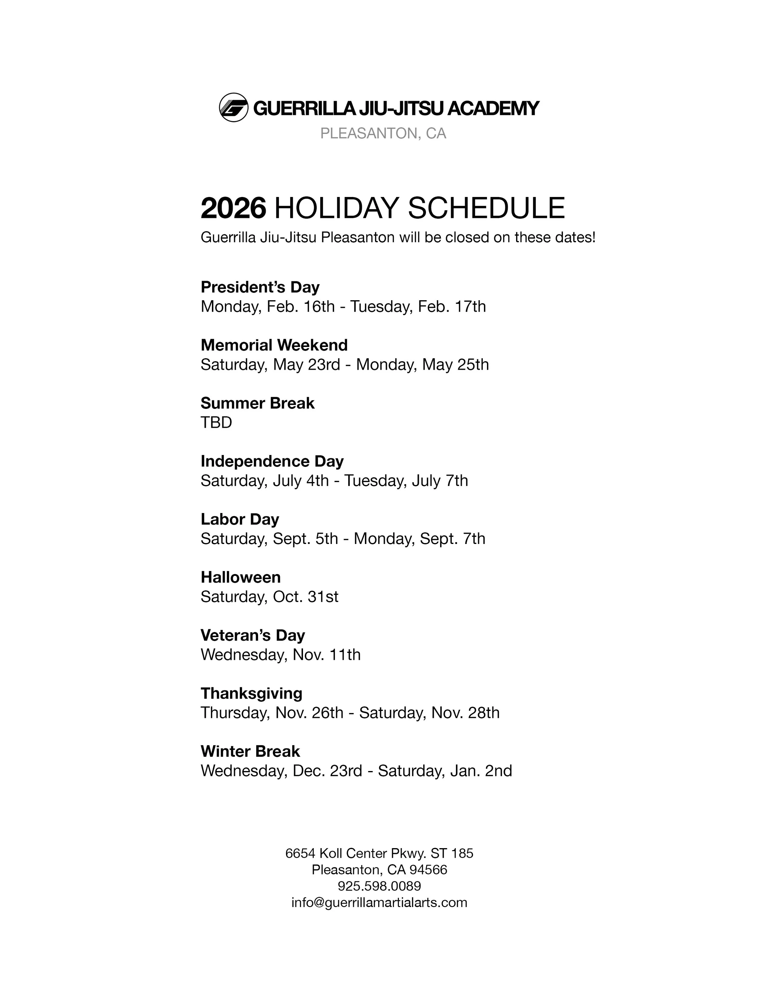 We hope you are having a good new year so far. This year we will have the usual holiday closures with open mats TBD. Here is the schedule for 2026. If you have any questions of concerns, we would love to hear from you via email, phone, or a visit at the front desk.